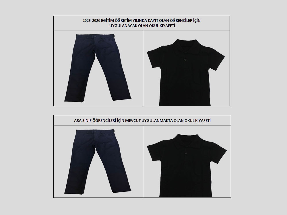 Millî Eğitim Bakanlığına Bağlı Okul Öğrencilerinin Kılık ve Kıyafetlerine Dair Yönetmelik ve Temel Eğitim Genel Müdürlüğünün 31/12/2024 tarihli yazısı ekinde bulunan “Okullarda Öğrencilerin Kıyafet / Formalarının Belirlenmesine Dair Usul ve Esaslar” da belirtilen 2025-2026 Eğitim-Öğretim yılından itibaren okul kıyafet/formalarının standartları yaş/sınıf seviyesine, okul türüne ve öğrencilerin fiziksel gelişimine uygun olacak şekilde özel işaret, baskı ve desen gibi kısıtlayıcı ayrıntılara yer verilmeden belirlenecektir hükmü uyarınca, okul öğrenci kıyafet / formaları aşağıdaki şekilde belirlenmiştir. Ara sınıflarda öğrenim gören öğrencilerimiz için önceki mevcut okul kıyafetleri kullanılmaya devam edilecek olup, yeni okul kıyafeti isteğe bağlıdır. |